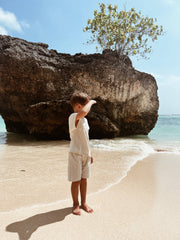 BERTY Shorts * Unisex model * Shorts made of 100% cotton * Elastic waistband * Decorative coconut button at the front. * Color: Black striped and beige.